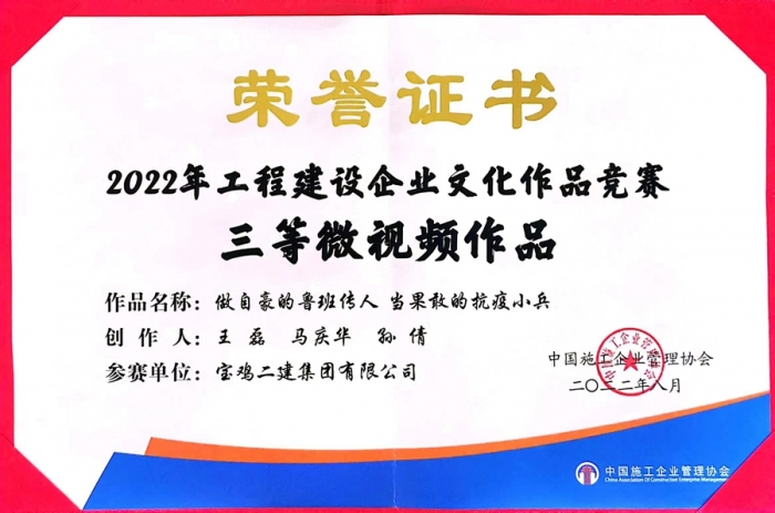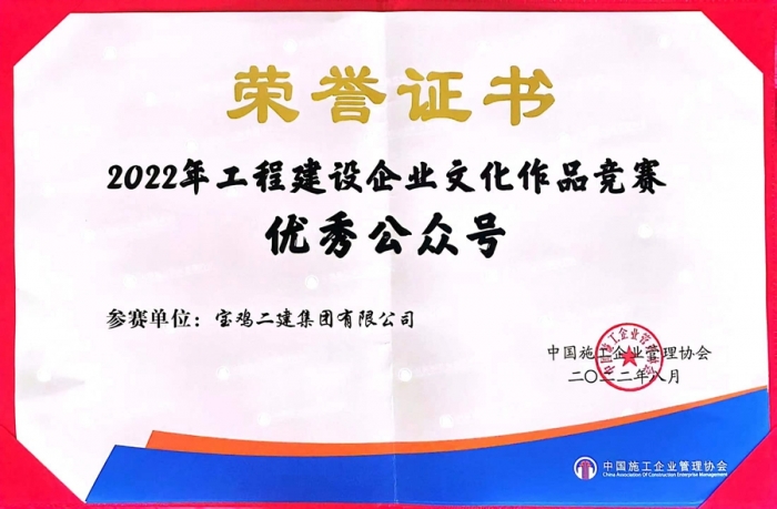 在喜迎二十大之際,中國(guó)施工企業(yè)管理協(xié)會(huì)在南寧隆重召開2022年度工程建設(shè)企業(yè)文化成果交流會(huì),會(huì)議公布了2022年度工程建設(shè)企業(yè)文化作品競(jìng)賽評(píng)選結(jié)果,并進(jìn)行表彰。寶雞二建公眾號(hào)被評(píng)為“全國(guó)工程建設(shè)行業(yè)優(yōu)秀公眾號(hào)”,企業(yè)文化作品《做自豪的魯班傳人 當(dāng)果敢的抗疫小兵》微視頻榮獲三等獎(jiǎng)。